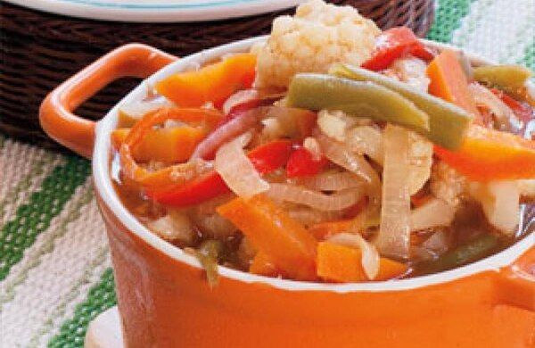 En una olla hervir agua con laurel y un ajo cuando el agua hierva a borbotones agregar el vinagre sal, añadir los vegetales cortados en julianas.